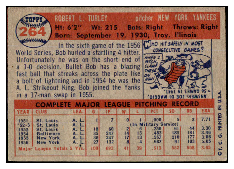 1957 Topps Baseball #264 Bob Turley Yankees EX 524972