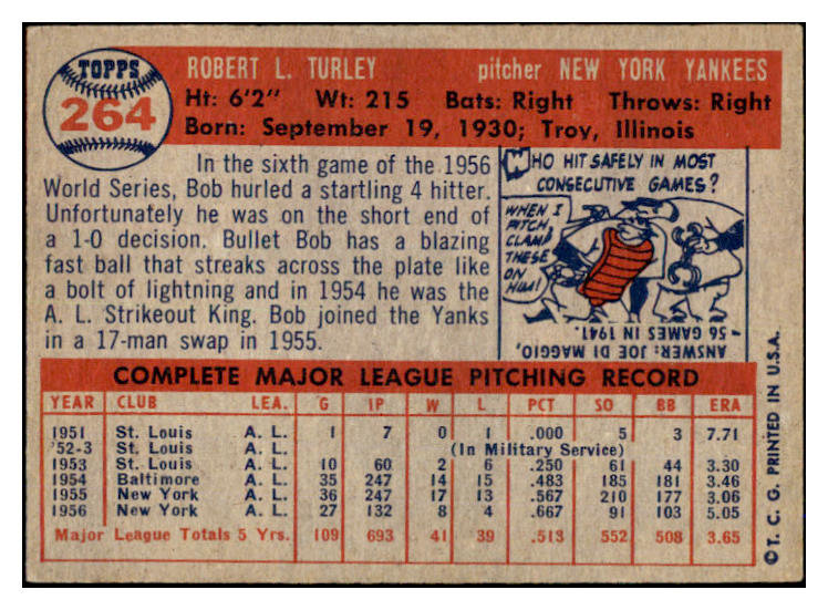 1957 Topps Baseball #264 Bob Turley Yankees EX-MT 527527