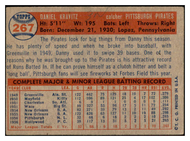 1957 Topps Baseball #267 Danny Kravitz Pirates EX 533773