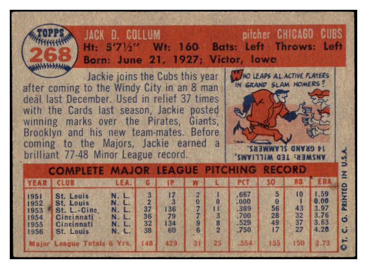 1957 Topps Baseball #268 Jackie Collum Cubs EX-MT 523897