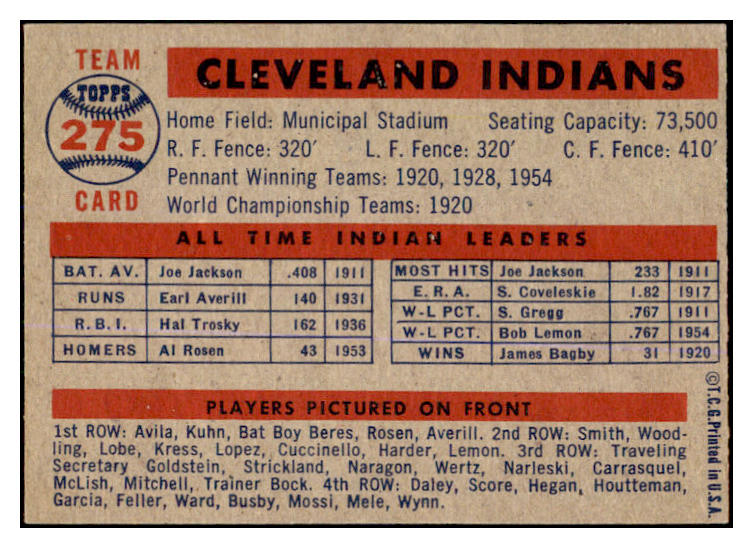 1957 Topps Baseball #275 Cleveland Indians Team EX+/EX-MT 527602