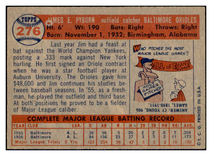 1957 Topps Baseball #276 Jim Pyburn Orioles EX-MT 532574