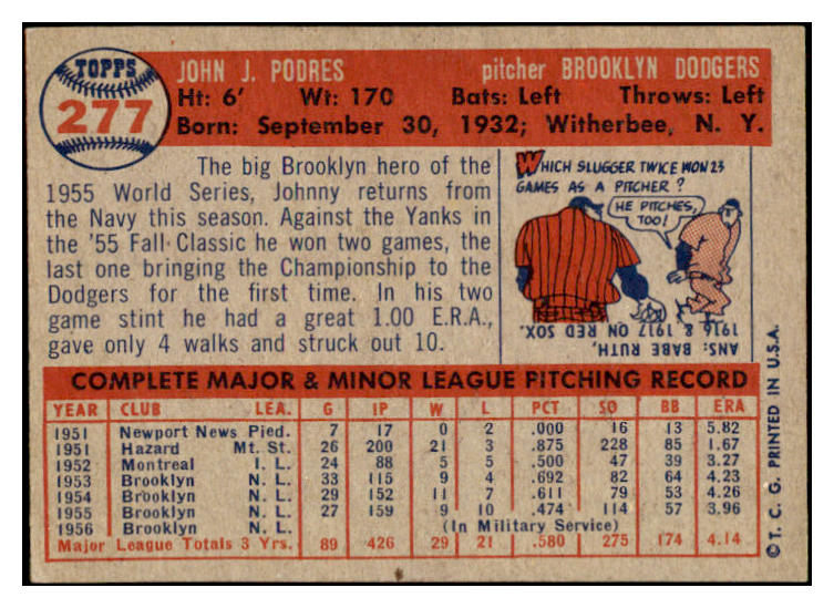 1957 Topps Baseball #277 Johnny Podres Dodgers EX+/EX-MT 530309
