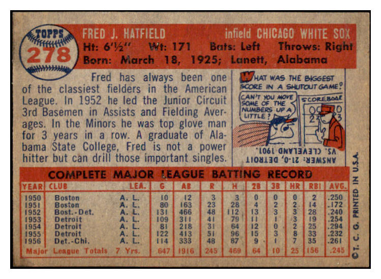 1957 Topps Baseball #278 Fred Hatfield White Sox EX-MT 530377