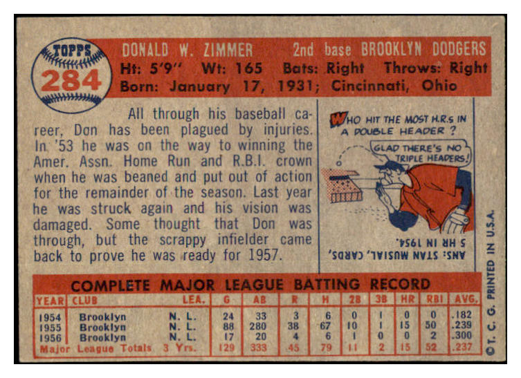 1957 Topps Baseball #284 Don Zimmer Dodgers EX-MT 530405