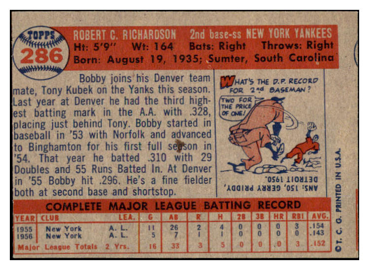 1957 Topps Baseball #286 Bobby Richardson Yankees EX 524951