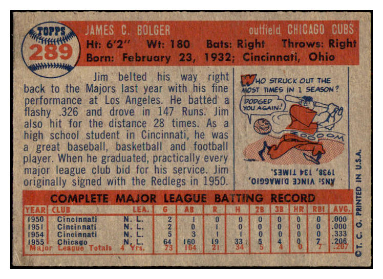 1957 Topps Baseball #289 Jim Bolger Cubs EX-MT 523871