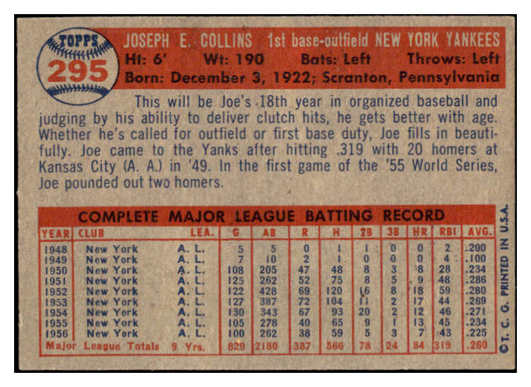 1957 Topps Baseball #295 Joe Collins Yankees EX-MT 530262
