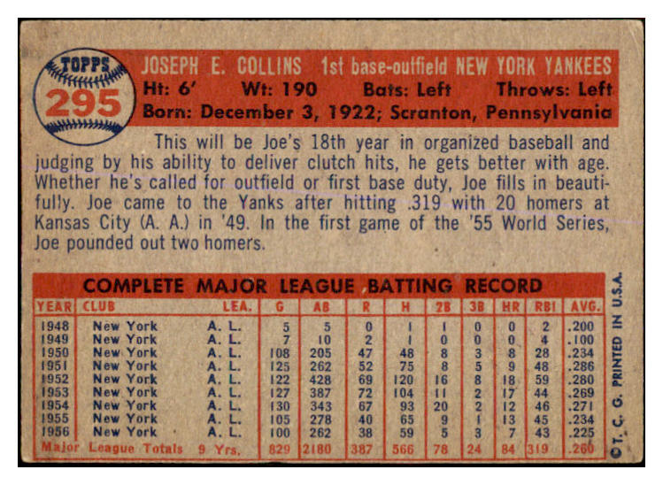 1957 Topps Baseball #295 Joe Collins Yankees VG-EX 527603