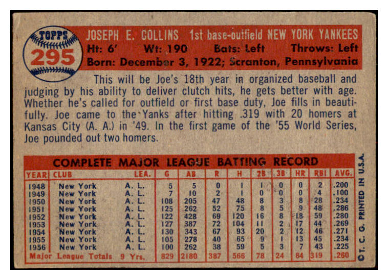 1957 Topps Baseball #295 Joe Collins Yankees VG-EX 530617