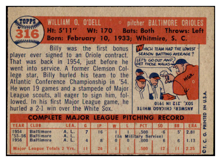 1957 Topps Baseball #316 Billy O'Dell Orioles EX-MT 523879