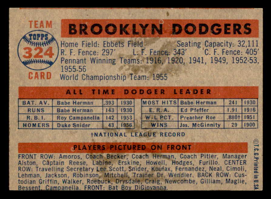 1957 Topps Baseball #324 Brooklyn Dodgers Team EX+/EX-MT 547204