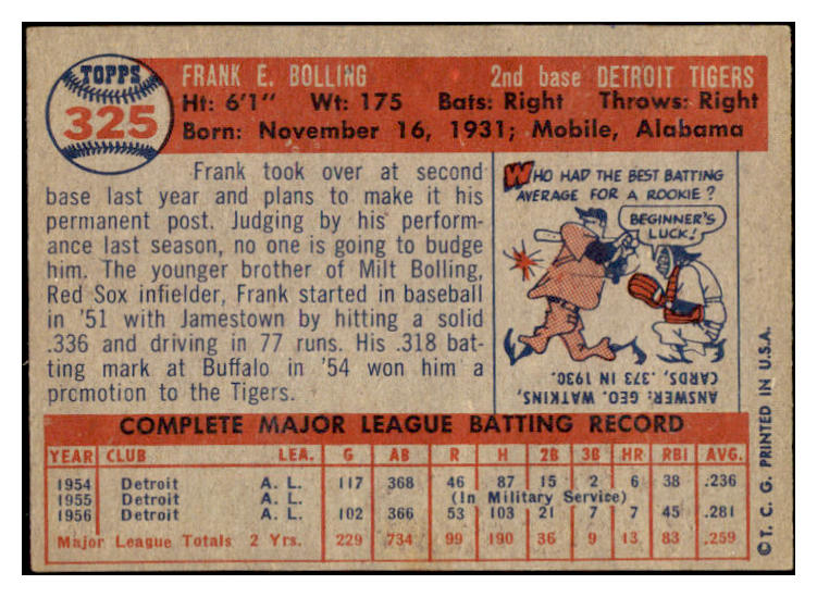 1957 Topps Baseball #325 Fran Bolling Tigers EX-MT 530388