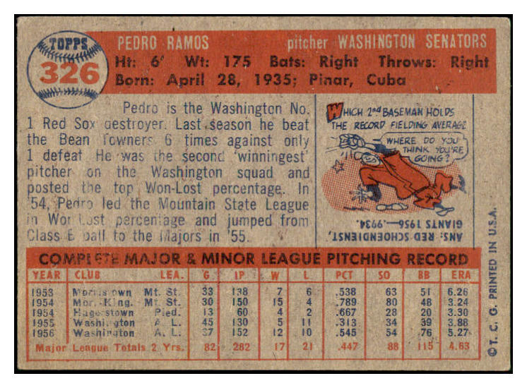 1957 Topps Baseball #326 Pedro Ramos Senators EX 508290