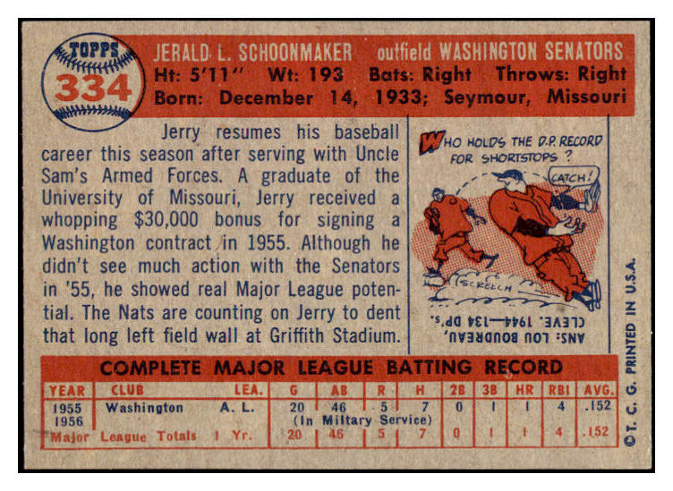 1957 Topps Baseball #334 Jerry Schoonmaker Senators EX-MT 525306