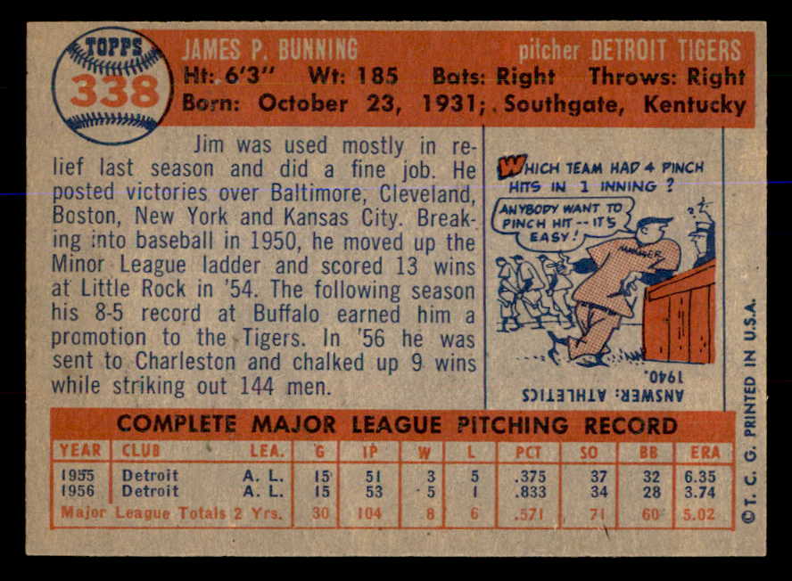 1957 Topps Baseball #338 Jim Bunning Tigers EX-MT oc 547898