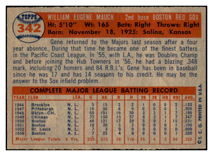 1957 Topps Baseball #342 Gene Mauch Red Sox EX-MT 533774