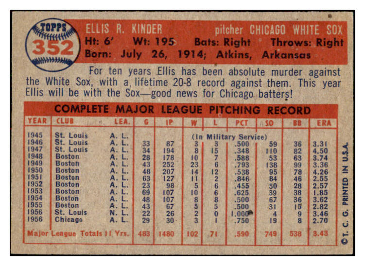 1957 Topps Baseball #352 Ellis Kinder White Sox EX 530619