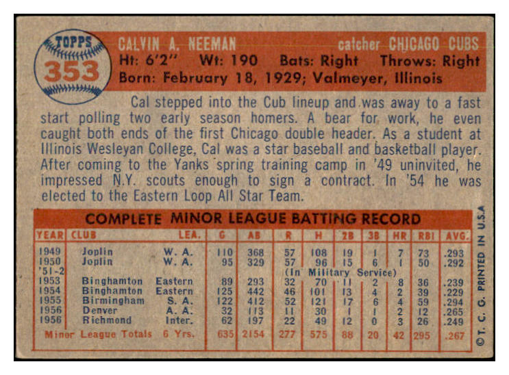 1957 Topps Baseball #353 Cal Neeman Cubs EX-MT 535502
