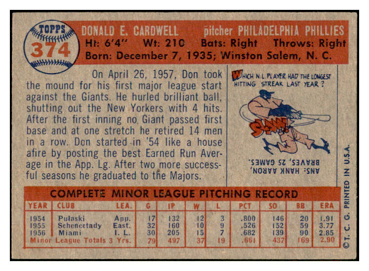 1957 Topps Baseball #374 Don Cardwell Phillies EX-MT 533805