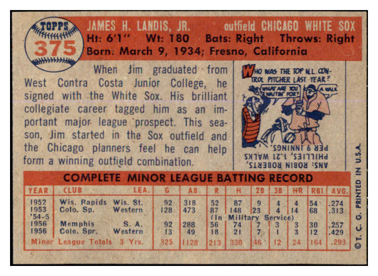 1957 Topps Baseball #375 Jim Landis White Sox EX-MT 527674