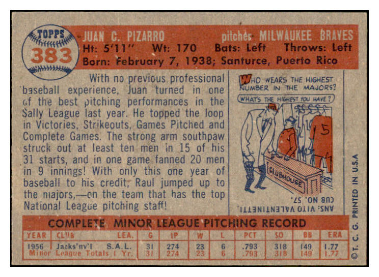 1957 Topps Baseball #383 Juan Pizarro Braves EX-MT 533802
