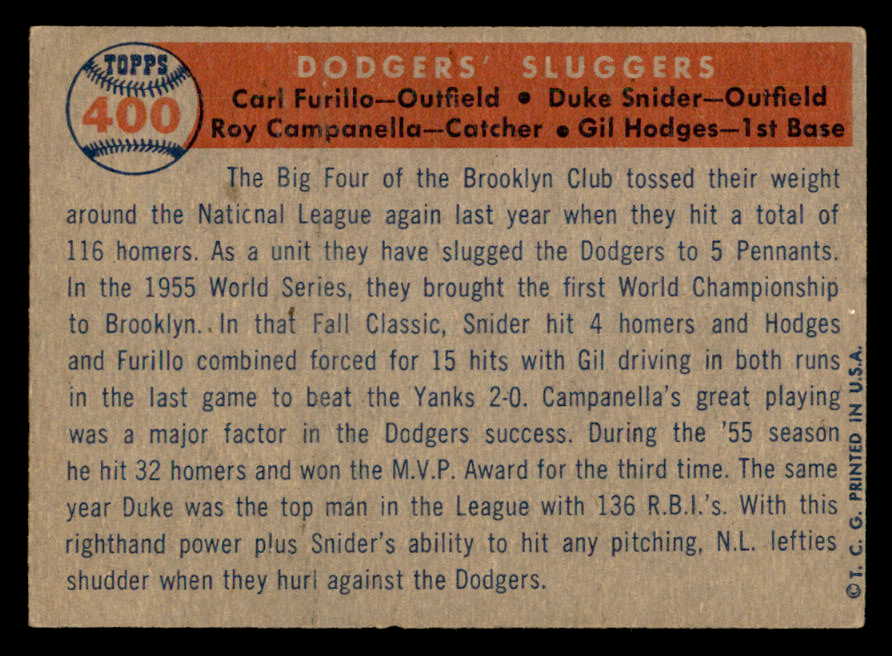 1957 Topps Baseball #400 Roy Campanella Duke Snider Gil Hodges EX-MT 547216