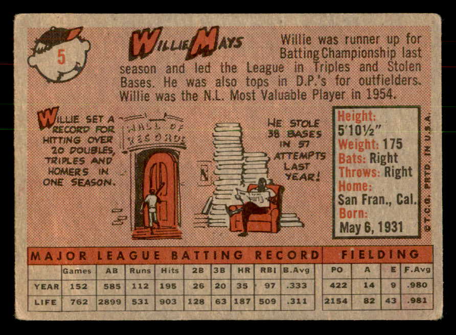 1958 Topps Baseball #005 Willie Mays Giants VG 541282