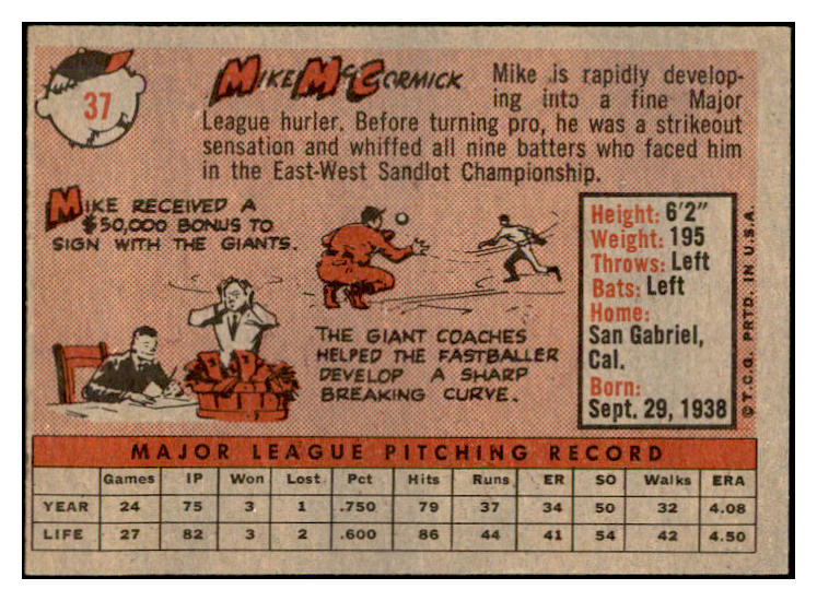 1958 Topps Baseball #037 Mike McCormick Giants EX-MT 535570