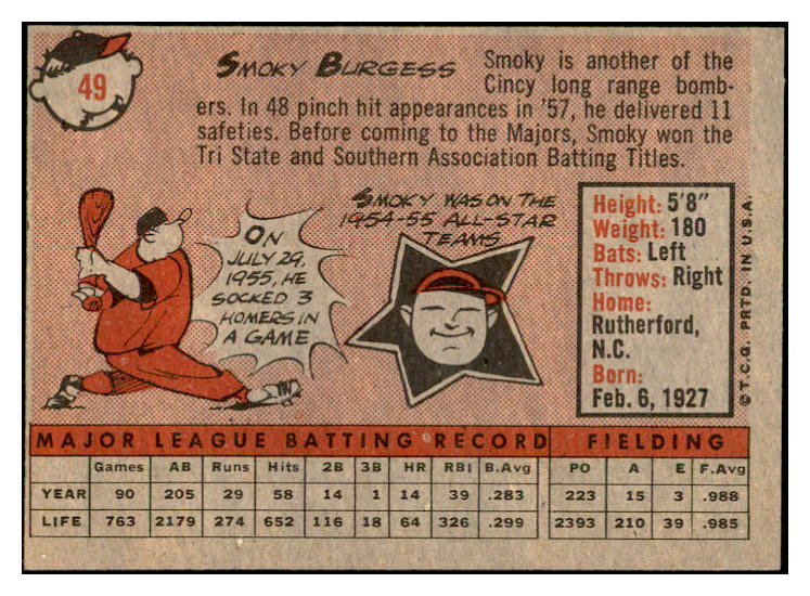 1958 Topps Baseball #049 Smoky Burgess Reds EX-MT 535580