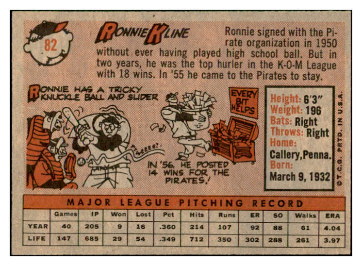 1958 Topps Baseball #082 Ronnie Kline Pirates EX-MT 535622
