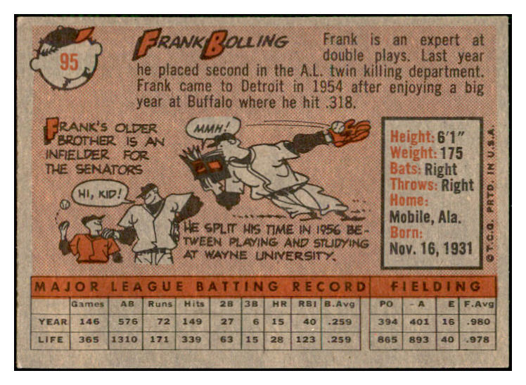 1958 Topps Baseball #095 Frank Bolling Tigers EX-MT 535635