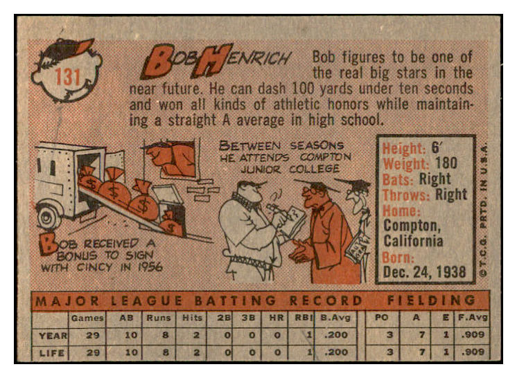 1958 Topps Baseball #131 Bob Henrich Reds EX-MT 535677