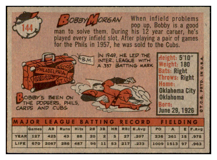 1958 Topps Baseball #144 Bobby Morgan Cubs EX-MT 535693