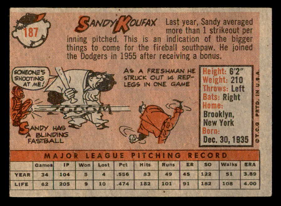 1958 Topps Baseball #187 Sandy Koufax Dodgers EX 539220