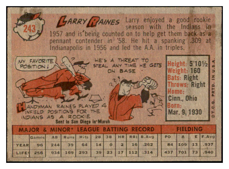 1958 Topps Baseball #243 Larry Raines Indians EX-MT 535826