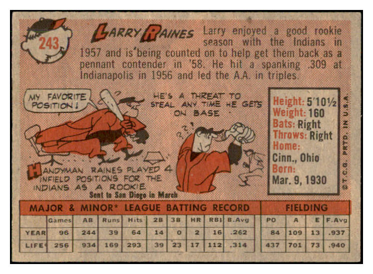 1958 Topps Baseball #243 Larry Raines Indians EX-MT 535827