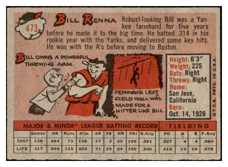 1958 Topps Baseball #473 Bill Renna Red Sox EX-MT 530350