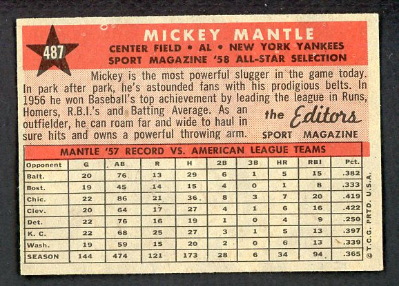 1958 Topps Baseball #487 Mickey Mantle A.S. Yankees EX-MT 529796