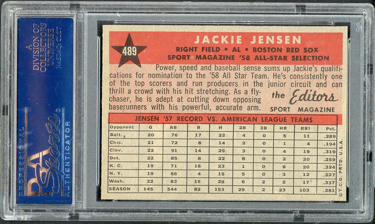 1958 Topps Baseball #489 Jackie Jensen A.S. Red Sox PSA 7 NM 546629