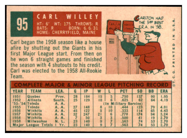 1959 Topps Baseball #095 Carl Willey Braves EX-MT 524189
