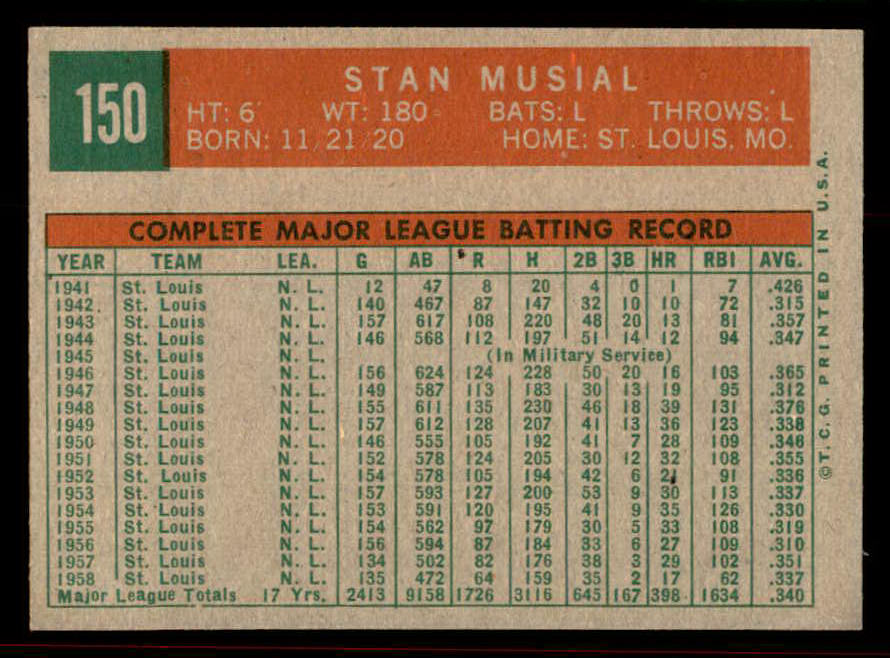 1959 Topps Baseball #150 Stan Musial Cardinals NR-MT 545612
