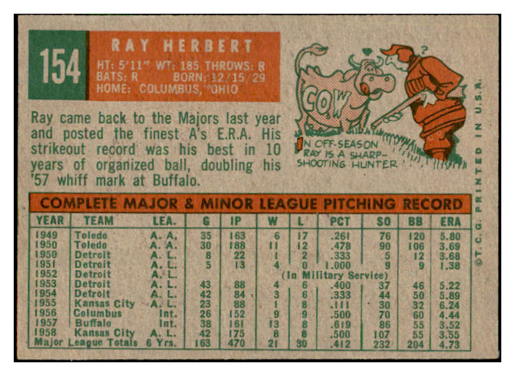 1959 Topps Baseball #154 Ray Herbert A's EX-MT 536149