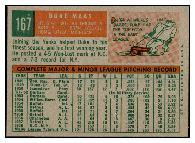 1959 Topps Baseball #167 Duke Maas Yankees EX-MT 536153