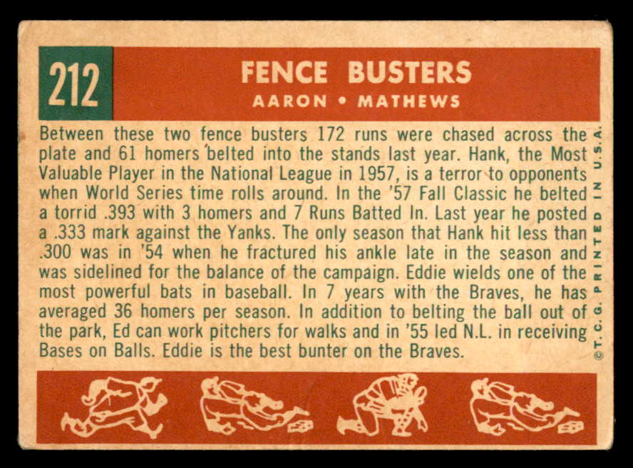 1959 Topps Baseball #212 Hank Aaron Eddie Mathews VG 540194