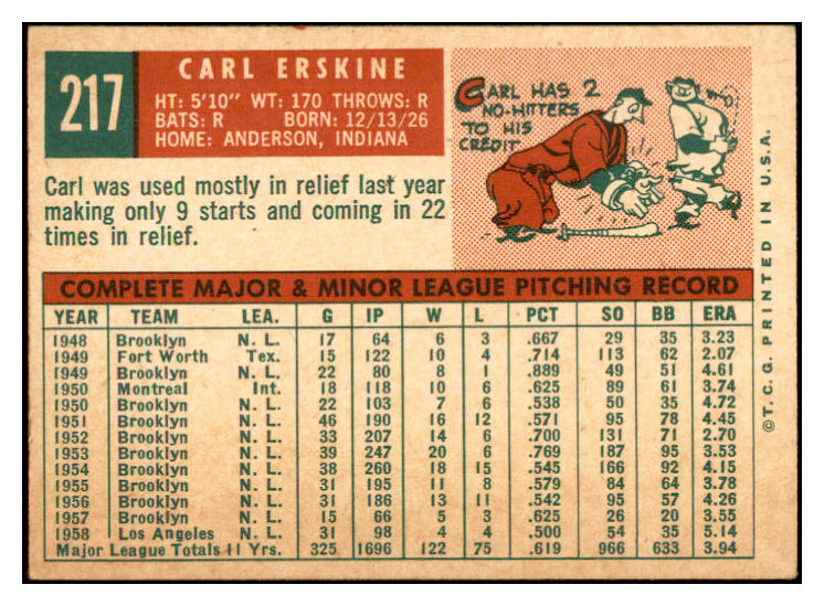 1959 Topps Baseball #217 Carl Erskine Dodgers EX-MT 532401