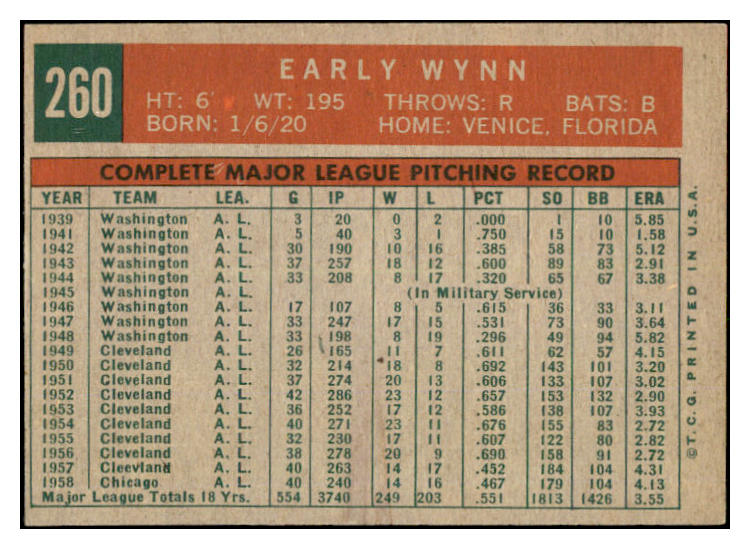 1959 Topps Baseball #260 Early Wynn White Sox EX-MT 527257