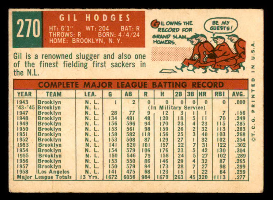 1959 Topps Baseball #270 Gil Hodges Dodgers EX 538845