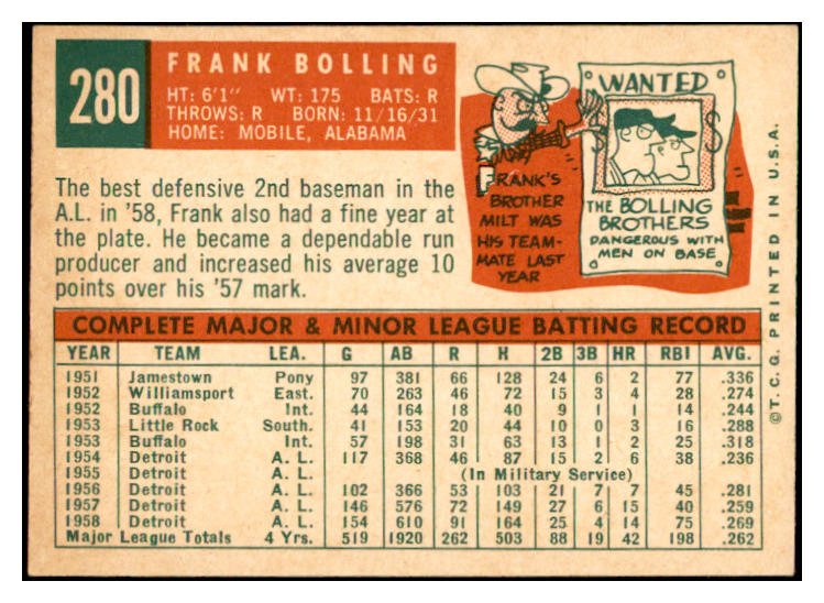 1959 Topps Baseball #280 Frank Bolling Tigers EX-MT 536192