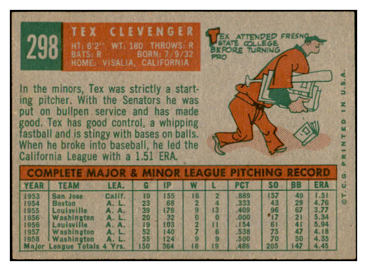1959 Topps Baseball #298 Tex Clevenger Senators EX-MT 536199
